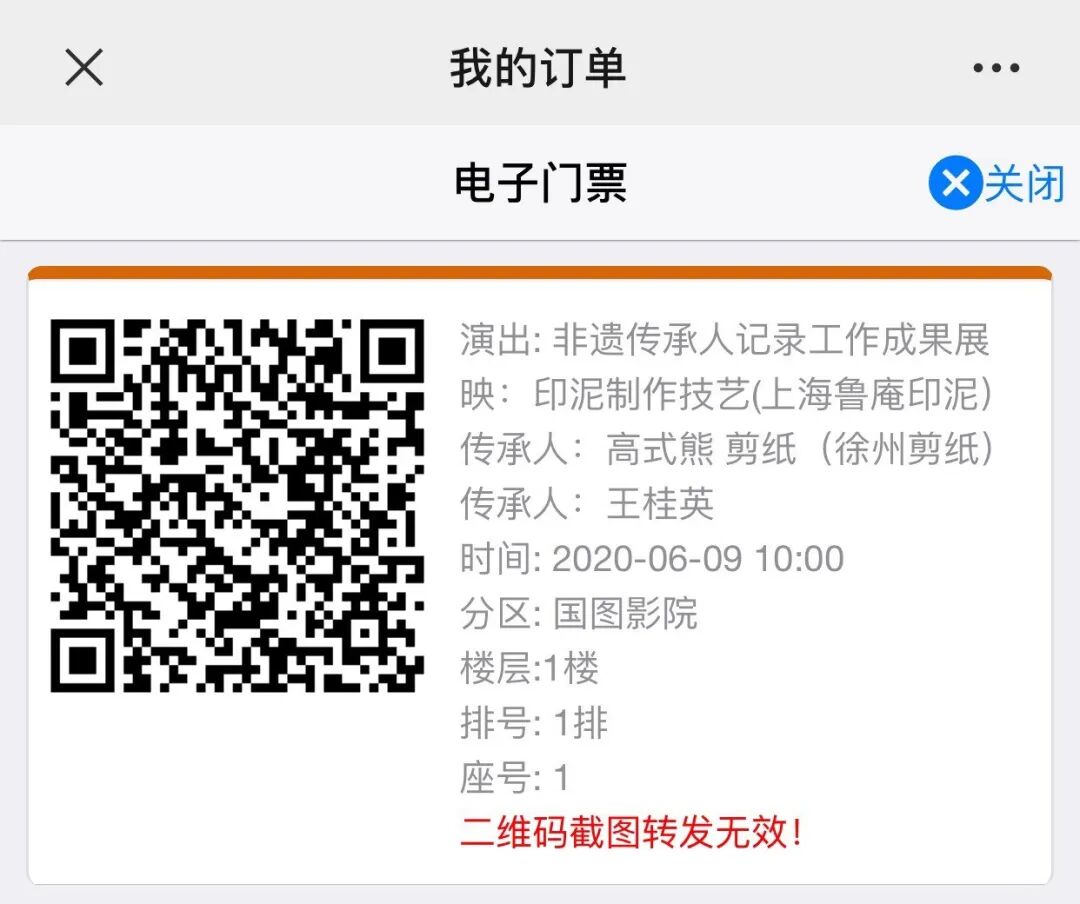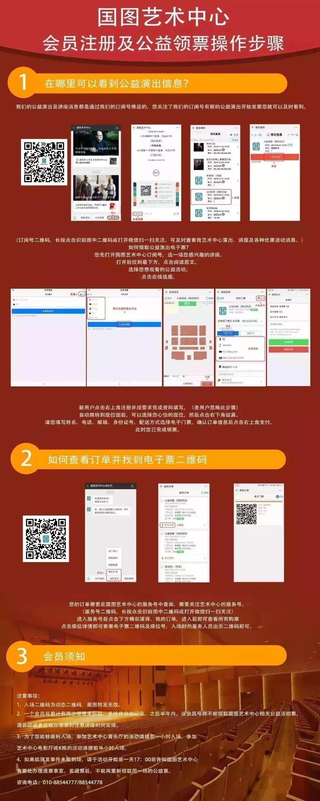1. 入场二维码为动态二维码,截图转发无效。 2. 一个会员号累计有两次领票未到后,系统将自动记录,之后半年内,该会员号将不能领取国图艺术中心相关公益活动票。请各位读者及观众领票时注意讲座时间安排。 3. 为了您能够顺利入场,参加艺术中心音乐厅的活动请提前一小时入场,参加国图影院或K栋的活动请提前半小时入场。 4. 如果临突发事件未能到场,请于活动开始前一天17:00前请电联售票处,联系电话:010-88544777/88544778,办理退票事宜。若退票后,不能再重新领取同一场的公益票。